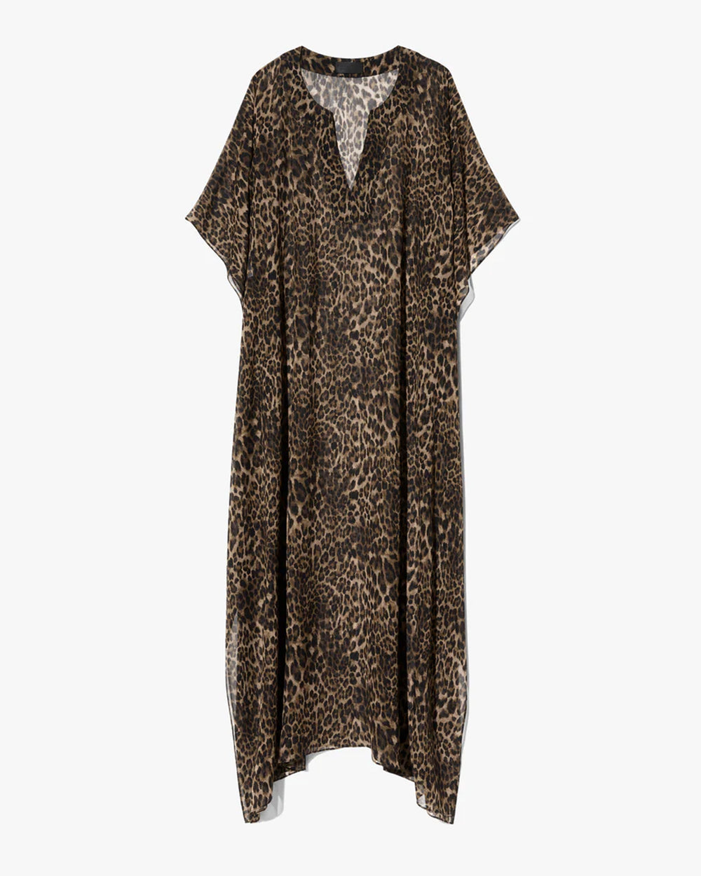 Relaxed fit caftan, cut from 100% leopard printed silk chiffon. The Erica Caftan is a pullover silhouette, featuring a V neckline, short sleeves and a semi sheer fabric. A perfect cover-up for the pool or the beach, all summer long.