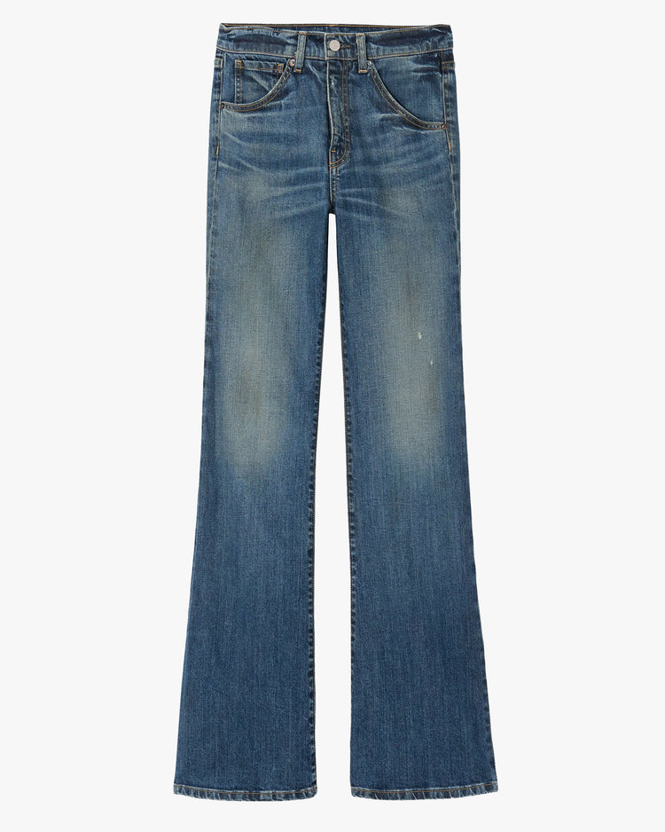 Slim fit jeans, cut from a washed stretch denim. High rise, featuring a full-length flared leg, zip fly, classic 5 pocket detailing and subtle distressed details.