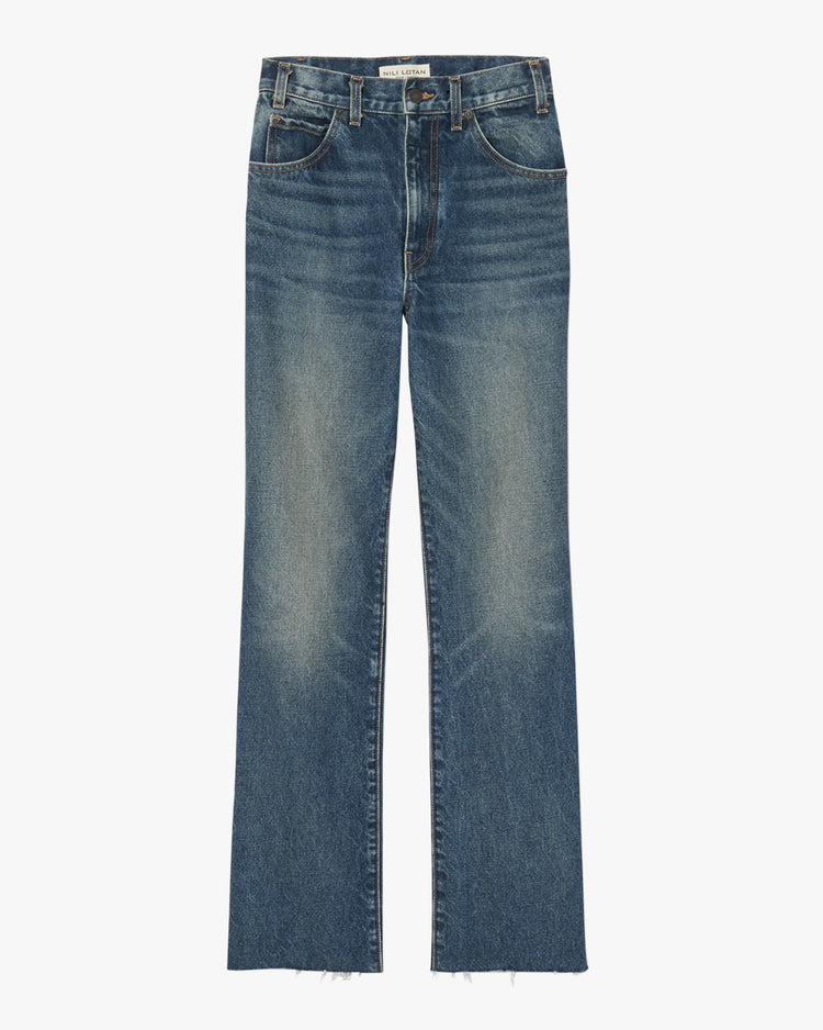 Relaxed fit jeans, cut from a Japanese non-stretch heavyweight crosshatch denim. High rise, featuring a slim, straight leg with a slight crop, zip fly, shank closure, classic 5 pocket detailing and raw hem, with distressed details.