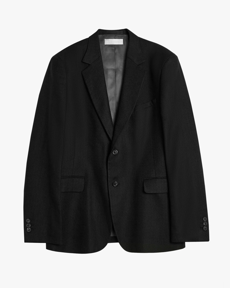 Relaxed fit suit jacket, cut from a striped twill viscose blend suiting. Single breasted, featuring sharp peak lapels, flap pockets, buttoned cuffs and vent at center back hem. Style with the matching Our Legacy Borrowed Chino.
