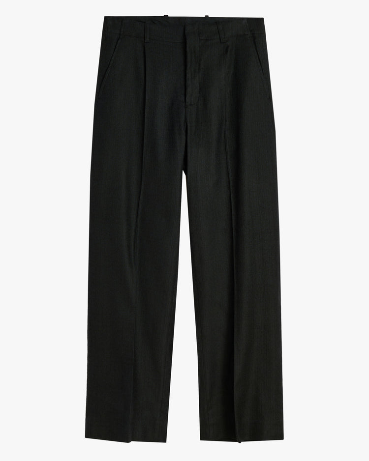 Relaxed fit trouser, cut from a woven cotton blend. A straight-wide leg silhouette, featuring inverse pleats at waistband and centre front leg creases for a more tailored finish. Wear with the matching Our Legacy Ceremony blazer