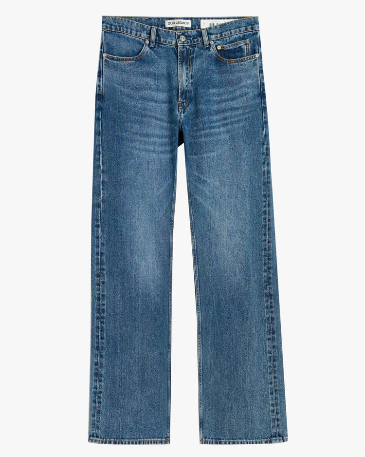 Relaxed fit 'Carlson Cut' jean, cut from an Indigo dyed Japanese cotton. The broken twill denim interrupts its traditional diagonal lines to form an irregular, zigzag texture. A high-rise, straight cut jean, featuring a long boot cut flared leg, faded distressed details, five pockets, steel rivets, and classic Our Legacy details.