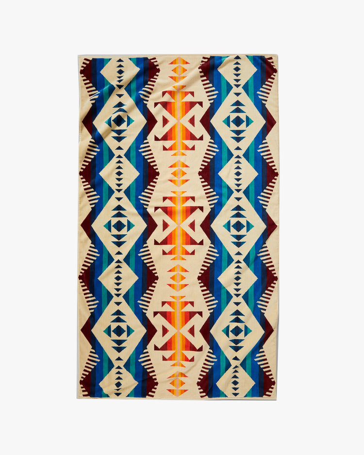 Oversized beach towel, made from an extra-plush terry velour toweling. Featuring Featuring all-over jacquard print, a velvet side and a looped side for absorbency. Thick and Luxurious, perfect for the beach, pool, or hot tub.