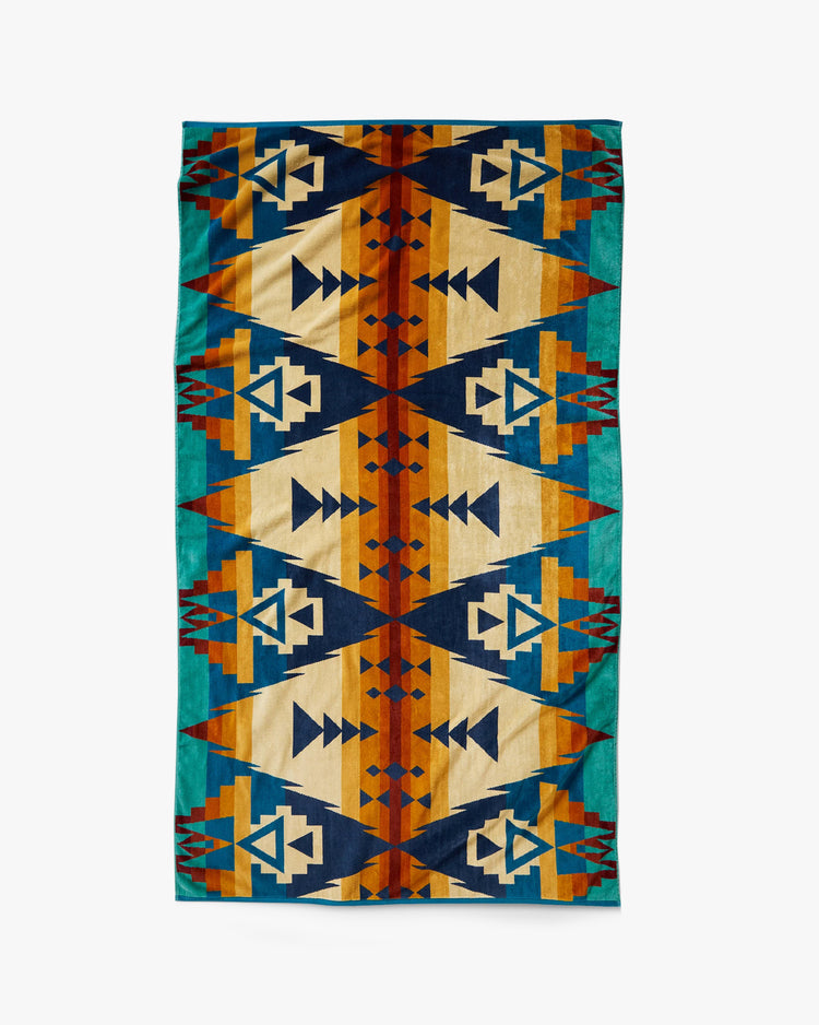 Oversized beach towel, made from an extra-plush terry velour toweling. Featuring Featuring all-over jacquard print, a velvet side and a looped side for absorbency. Thick and Luxurious, perfect for the beach, pool, or hot tub.
