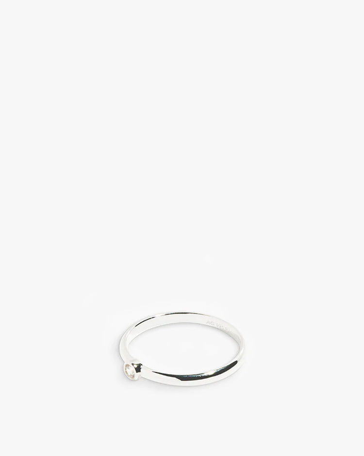 A delicate ring, crafted from 925 Sterling Silver. A round band adorned with a single round brilliant cut gemstone in a bezel setting.