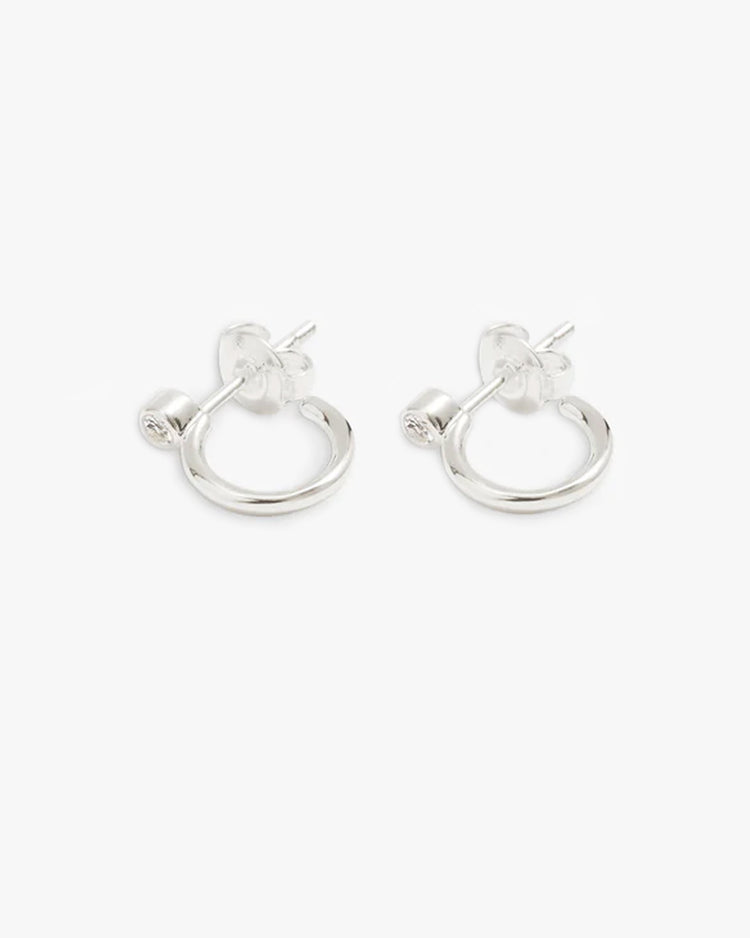 Classic hoop earrings, crafted from sterling silver. An elegant style, bezel set with a floating CZ gemstone at the top of the hoop. These earrings exude simplicity and elegance.