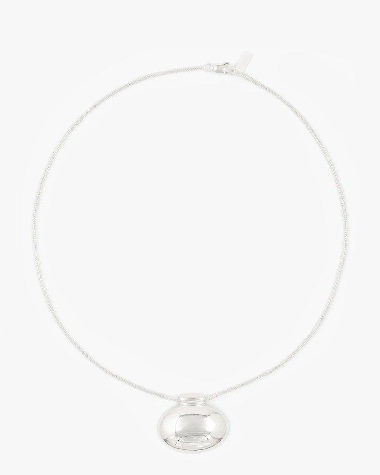 A chunky pendant necklace, crafted from sterling silver. Featuring a large oval concave pendant strung on a 40cm long snake chain.