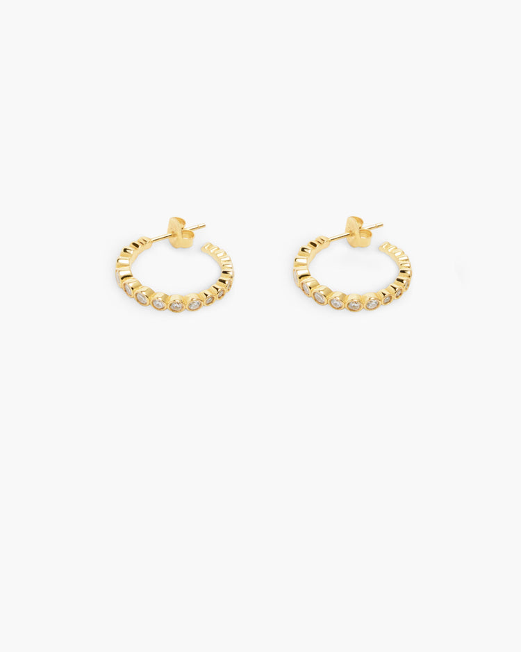 Hoop earrings, crafted from a sterling silver base, plated in 18k yellow gold. Adorned with a row of round shimmering cubic zirconia stones in varied sizes. Sold as a pair, elevating any outfit with a touch of charm.