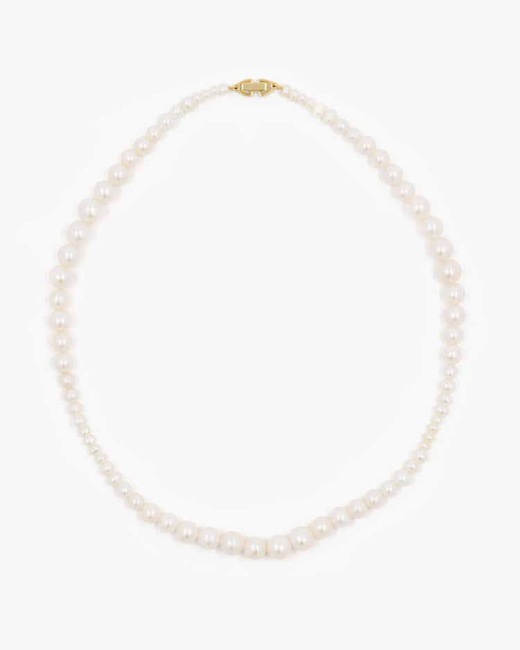 Elegant pearl necklace, adorned with a row of freshwater pearls in varied sizes. Finished with an 18k gold plated fold over clasp. Perfectly imperfect.
