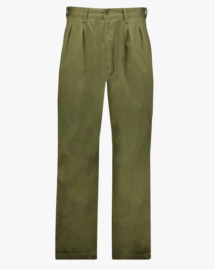 Relaxed wide fit trousers, cut from a Japanese cotton. Regular rise, featuring tailored waistband with belt loops, French pleats from waistband, concealed zip fly, side slant pockets and two buttoned back flap pockets.