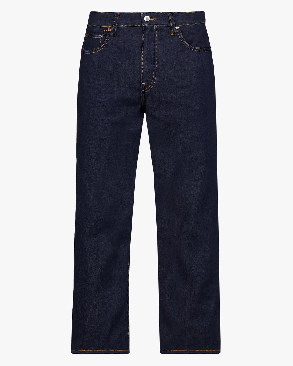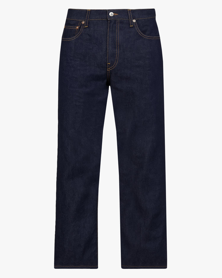 Wide fit jean, cut from a 12oz Japanese raw selvedge denim. Features a wide leg, classic 5-pocket denim detailing, hidden rivets, and a tapered hem. Inspired by vintage denim styles, with authentic sewing techniques and a unique sun-dried finish for a classic denim experience.