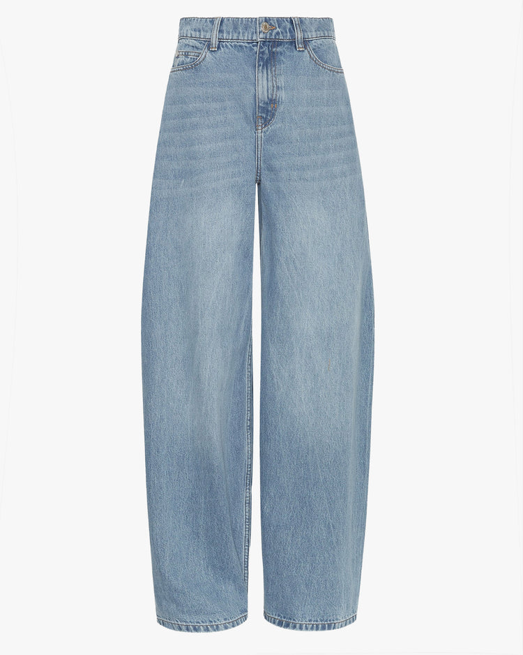 Wide fit jeans, cut from a light blue washed, mid-weight organic cotton denim. A barrel leg silhouette, featuring a mid rise, cinched waist, classic 5-pocket styling, contrast stitching, signature Stel leather logo patch and metal rivet at pocket.