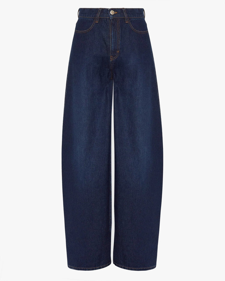 Wide fit jeans, cut from a dark blue washed, mid-weight organic cotton denim. A barrel leg silhouette, featuring a mid rise, cinched waist, classic 5-pocket styling, contrast stitching, signature Stel leather logo patch and metal rivet at pocket.