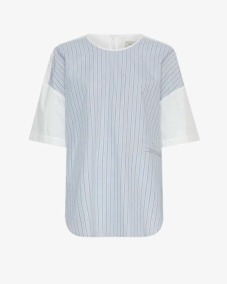 Relaxed fit top, cut from cotton lyocell blend. A t-shirt silhouette, featuring a crew neckline, dropped shoulders, short contrast sleeves, welt pocket at front, curved hem with splits, signature Stel stud, and a self tie at back neck.