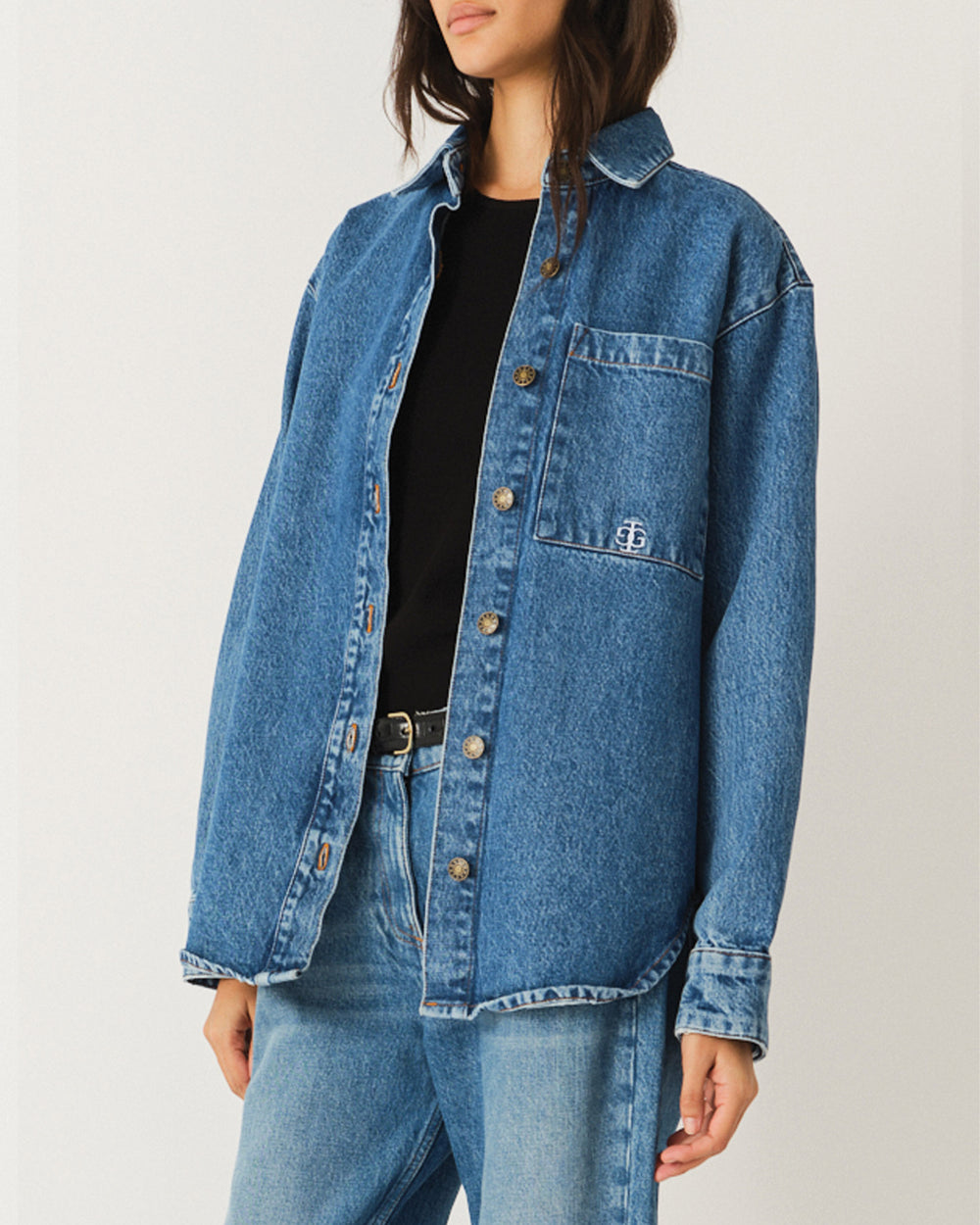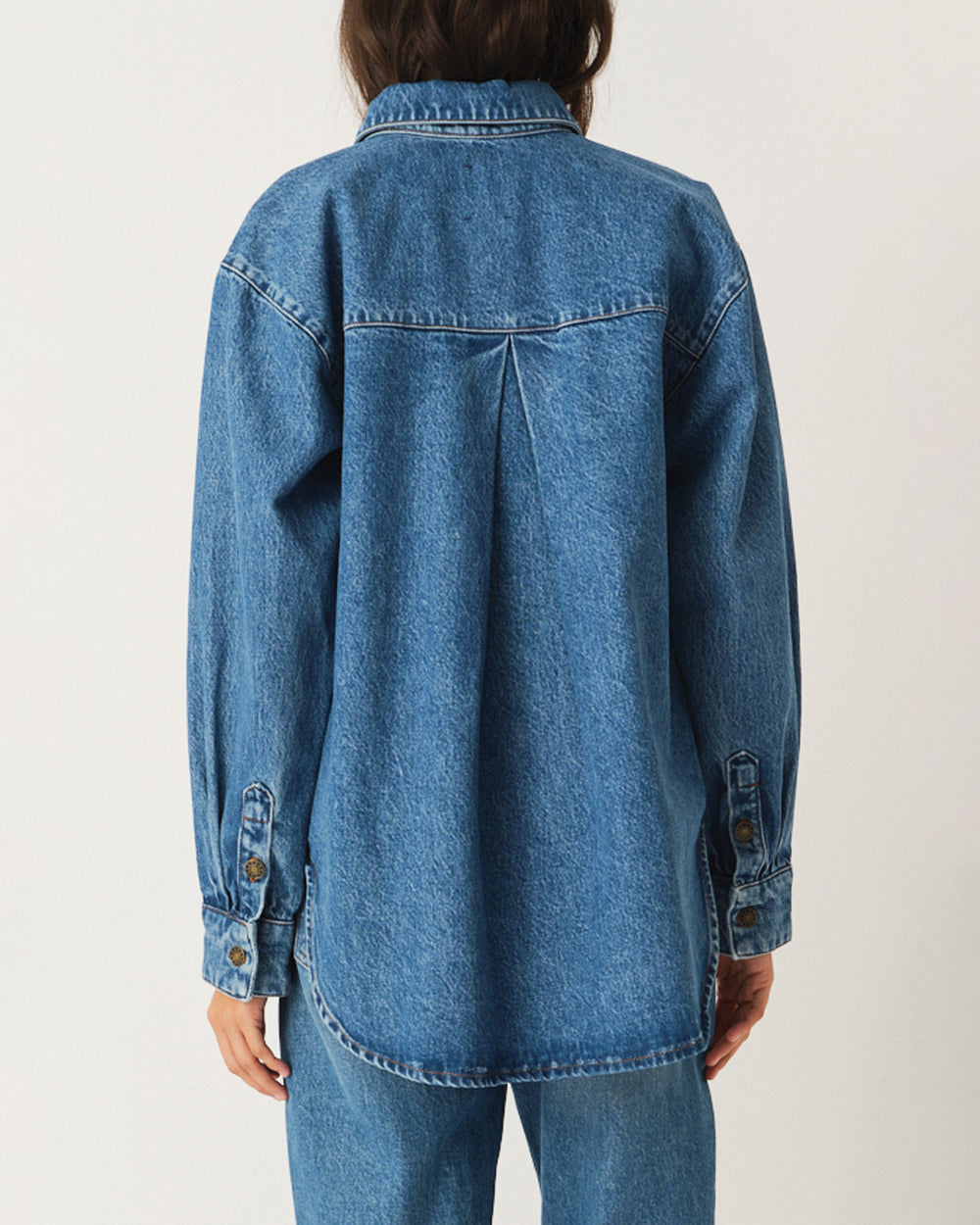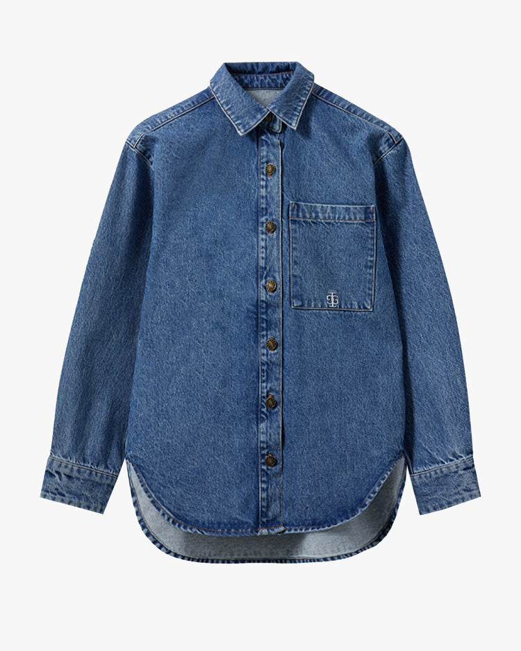 Relaxed fit jacket, cut from a washed organic cotton denim. A classic shirt silhouette, featuring a two piece collar, front placket with tack button closure, dropped shoulder, a single left chest patch pocket with embroidered logo, back yoke, center-back inverted pleat, curved shirt tail hem, buttoned pleated cuffs, and decorative top stitching.