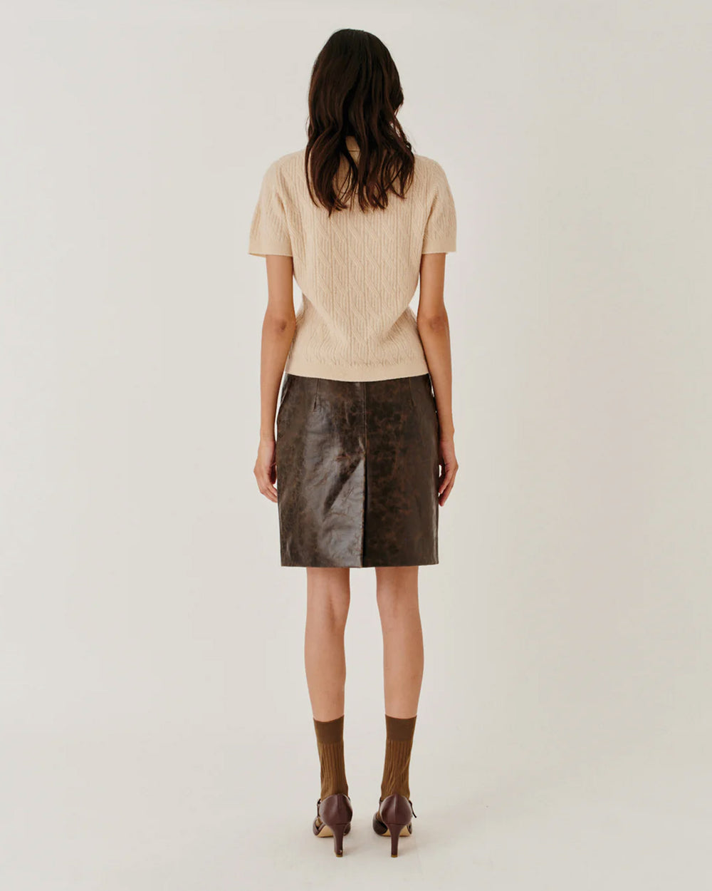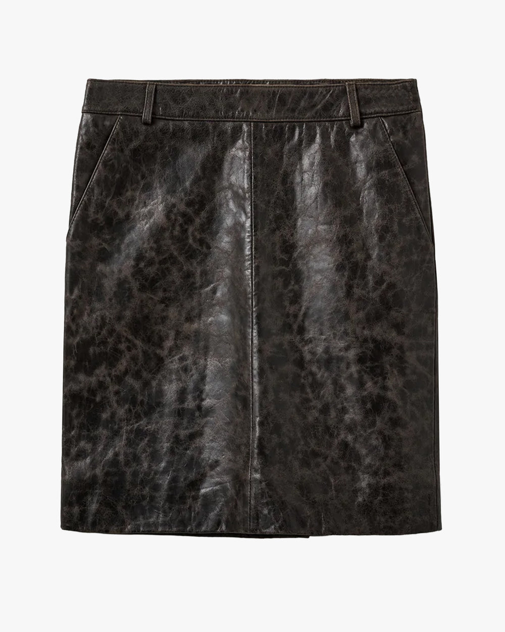 The Margo skirt is a straight silhouette crafted from lambskin leather with a distinctive crunched texture. Offering a bold, stylish statement with a sleek finish.