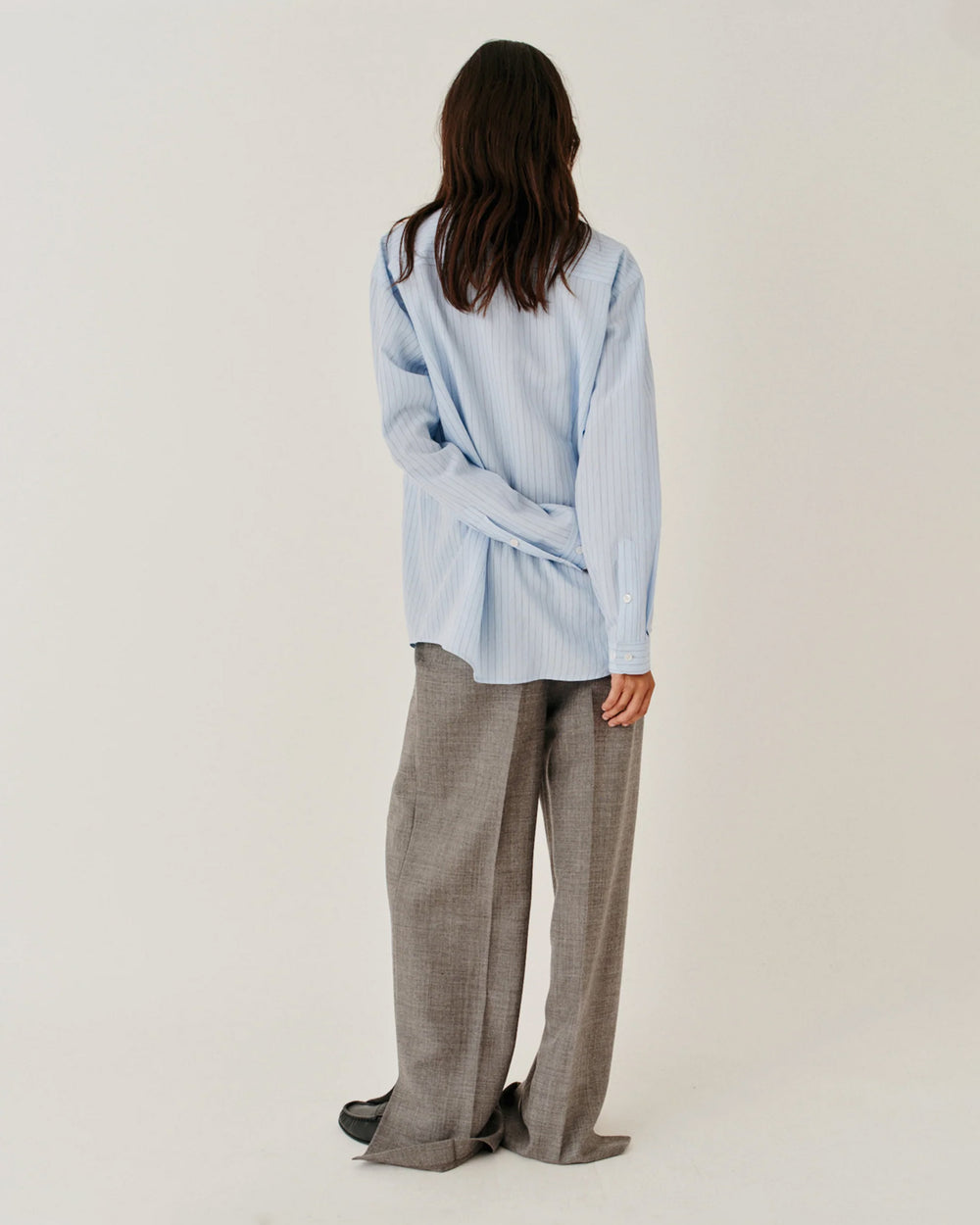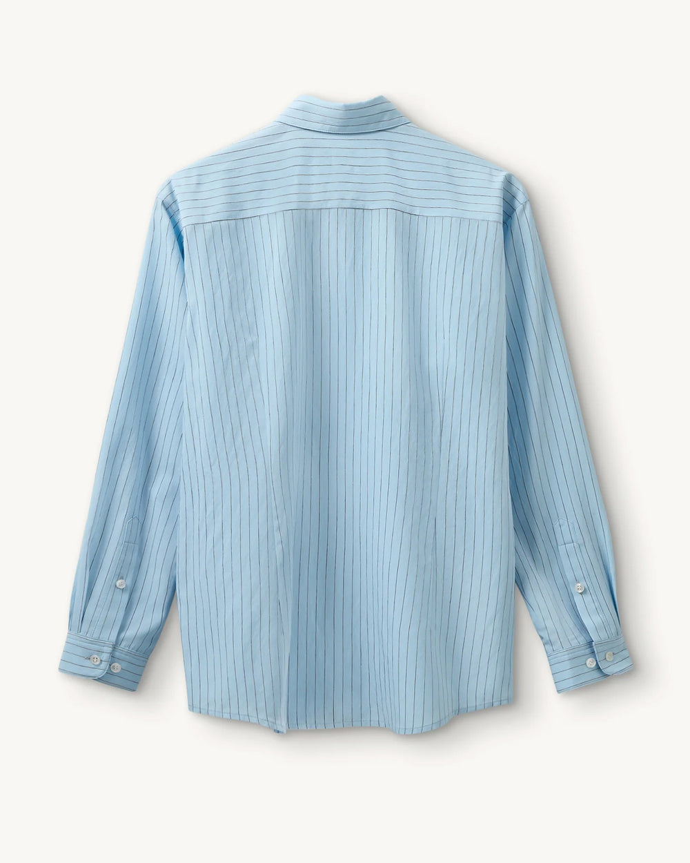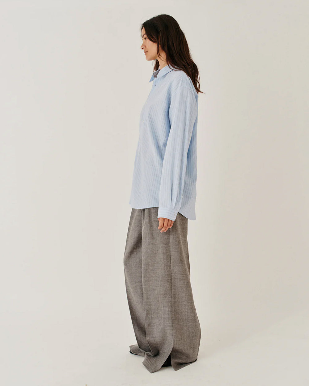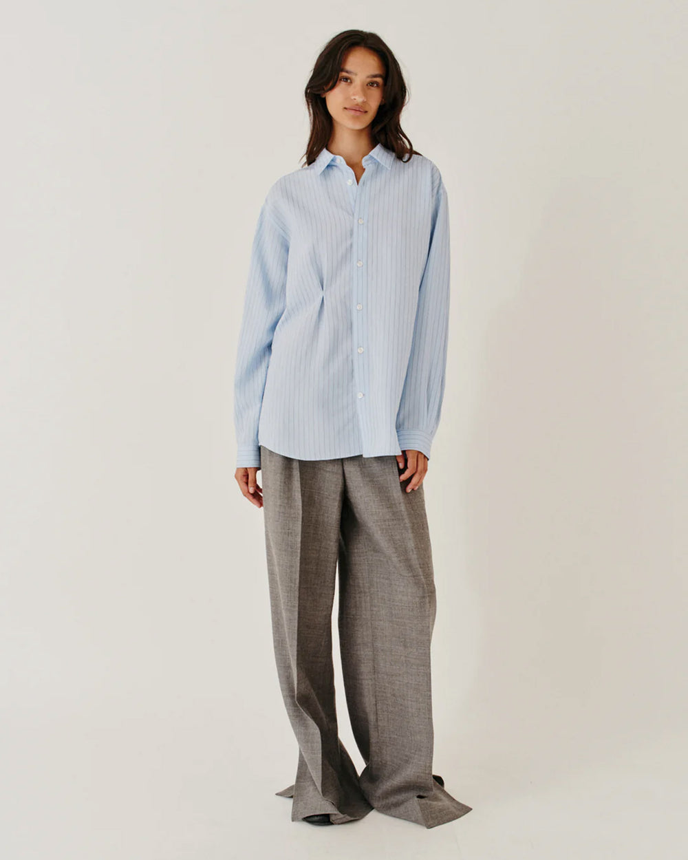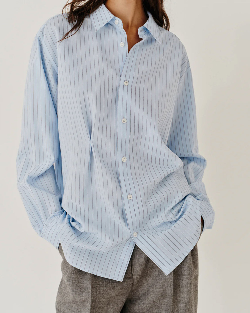 The Costa Shirt features an asymmetric draped button closure for two-way styling, adding a modern and sophisticated twist to a classic silhouette. Cut from a jacquard striped shirting, it's unique design elevates everyday style with effortless elegance. Pair with the Margo skirt from The Garment.