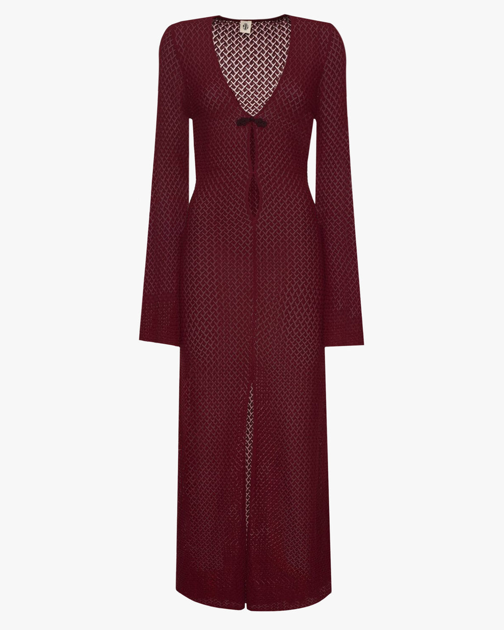Slim fit dress, made from an organic cotton pointelle knit. Featuring a deep V neckline with double keyhole at center front, toggle at neck, and slits on sleeves and center front skirt.