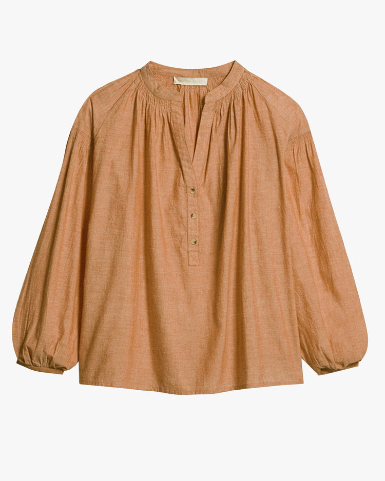 Relaxed fit blouse, cut from a 100% linen. Featuring a band collar, V neckline with half button placket, delicate gathers on dropped shoulders and neckline, and long voluminous sleeves.