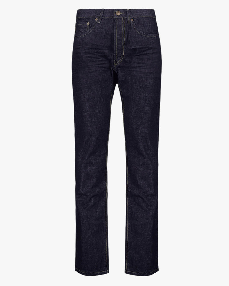 Classic fit straight leg jean, cut in Premium Japanese Kaihara 13.5oz 24 dip indigo ringspun denim. Mid rise. Classic five pocket detailing. Signature W twin needle top-stitch on back pockets. Dark whisker wash. Gold top stitching. Branded antique brass tack buttons and rivets.