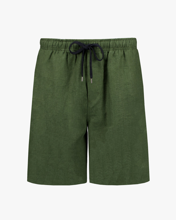 A Workshop Denim Summer classic. Relaxed fit shorts, cut from heavy weight linen. Featuring an elasticated drawstring waistband, side seam pockets and rear patch pocket.