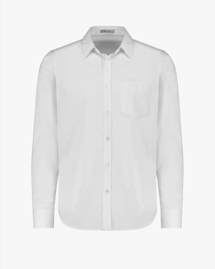 A core Workshop Denim silhouette. Slim fit shirt, cut from a cotton nylon stretch shirting. Featuring a two-piece collar, classic top-stitched front placket, single pocket with arrowhead topstitching detail on right chest, buttoned cuffs and finished with natural shell buttons. This versatile piece is ideal with dark indigo denim or tailored trousers.