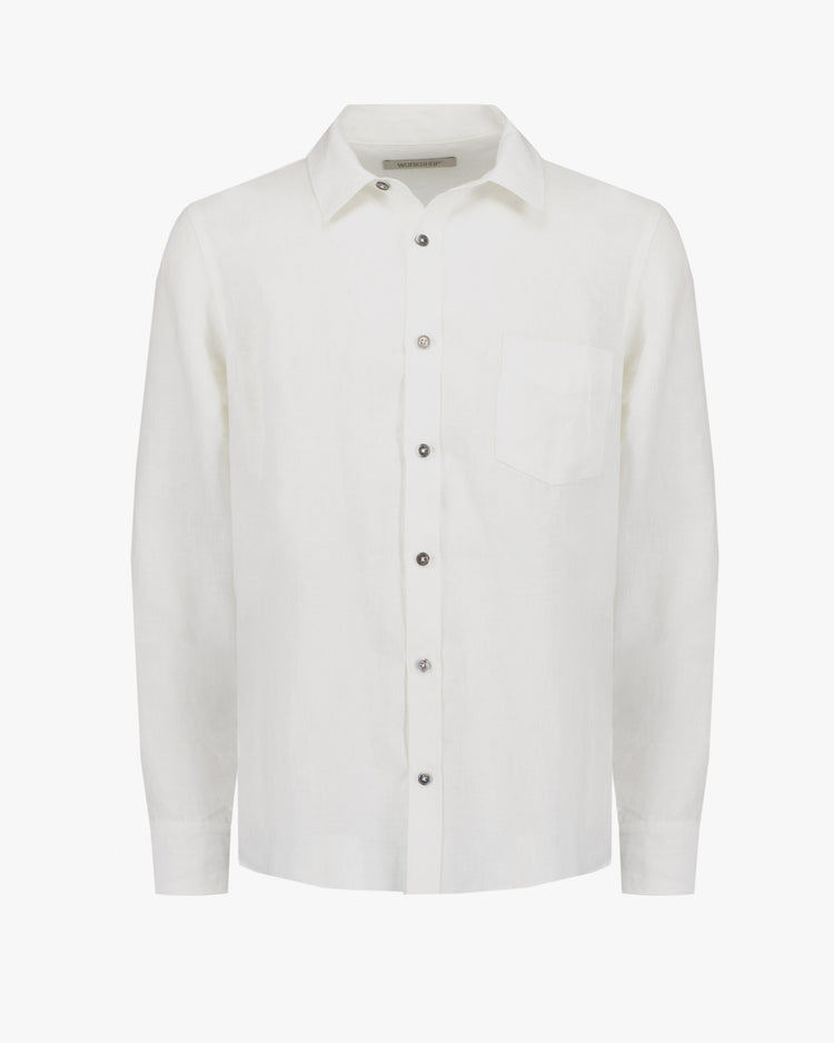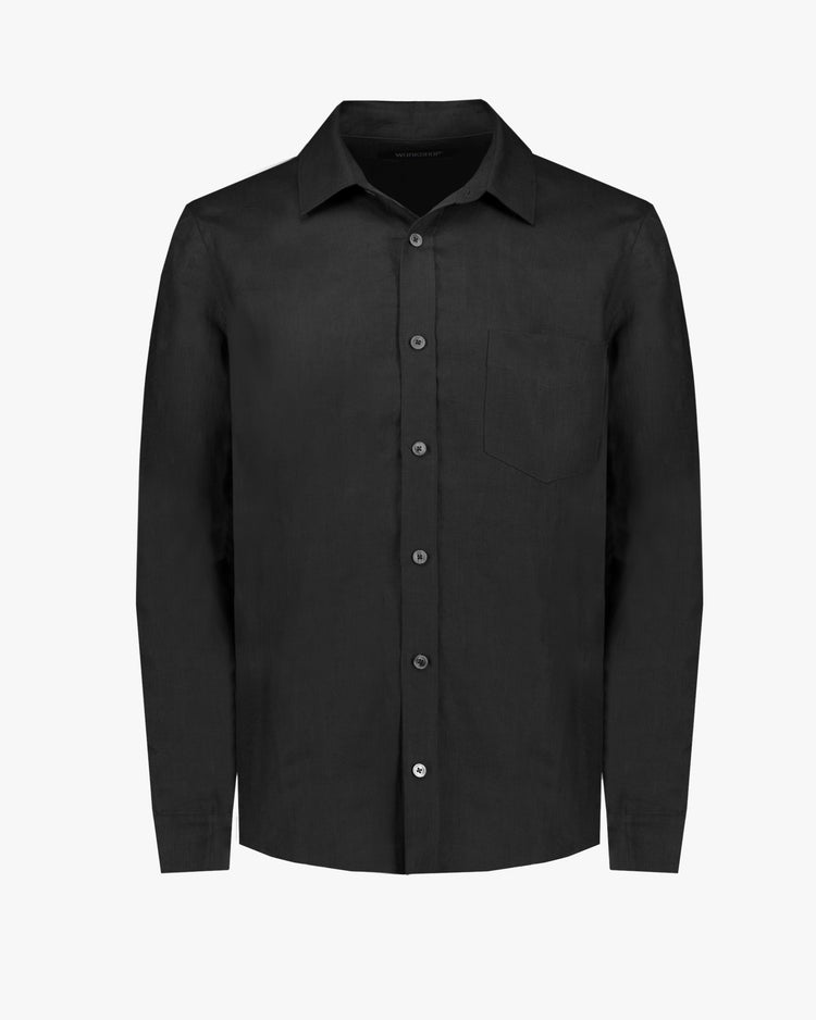 A core Workshop Denim silhouette. Standard fit shirt, cut from a superfine lightweight linen. Featuring a two-piece collar, classic top-stitched front placket, single arrowhead pocket at chest, buttoned cuff and sleeve placket and finished with natural dark shell buttons.
