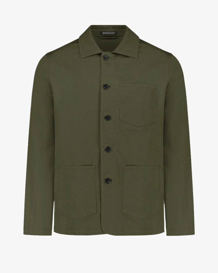 A core Workshop Denim style. Relaxed fit jacket, cut from a Japanese high twist cotton canvas. Classic utilitarian styling, featuring a two-piece collar, triple needle stitched constructions and reinforced patch pockets.