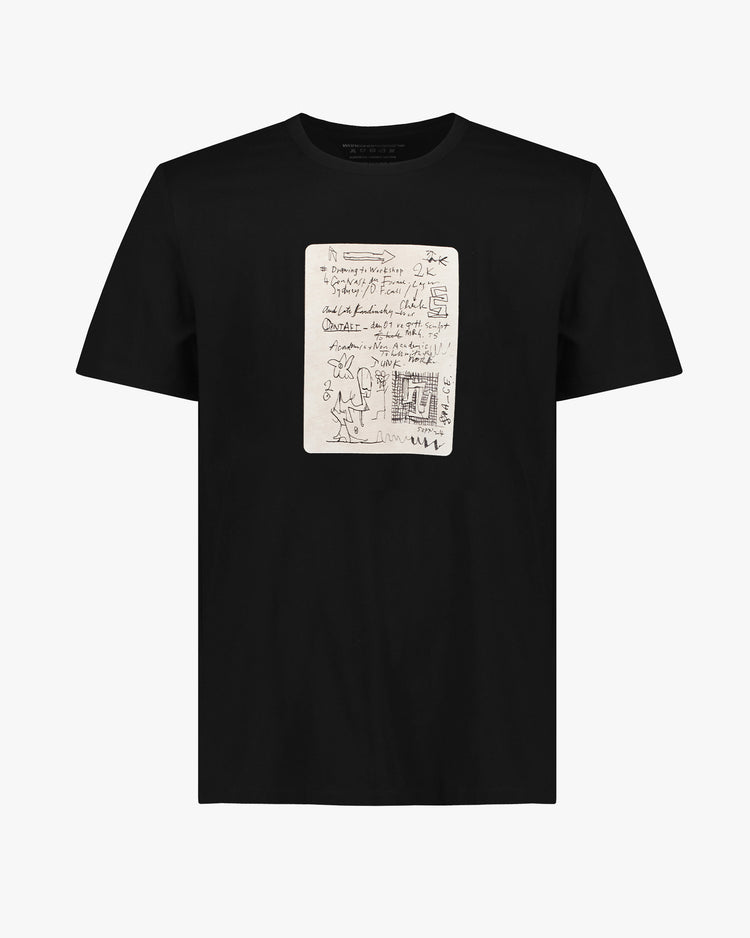 A core Workshop Denim style. Standard fit T-Shirt cut from superfine cotton jersey. Featuring a bound crew neckline, short sleeves and a straight hem. Enzyme washed to achieve a soft lived in hand feel. Featuring exclusive "Notepad" print by New Zealand Artist Martin Poppelwell.