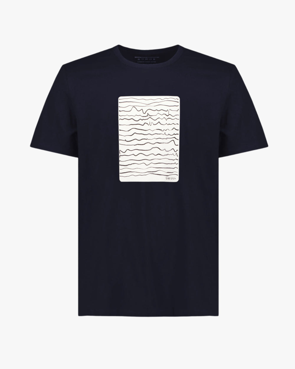 A core Workshop Denim style. Standard fit t-shirt cut from superfine cotton jersey. Featuring a bound crew neckline, short sleeves, straight hem. Enzyme washed to achieve a soft lived in hand feel. Featuring exclusive "Tidal" print by New Zealand Artist Martin Poppelwell.