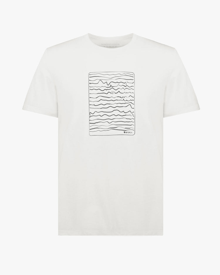 A core Workshop Denim style. Standard fit t-shirt cut from superfine cotton jersey. Featuring a bound crew neckline, short sleeves, straight hem. Enzyme washed to achieve a soft lived in hand feel. Featuring exclusive "Tidal Outline" print by New Zealand Artist Martin Poppelwell.